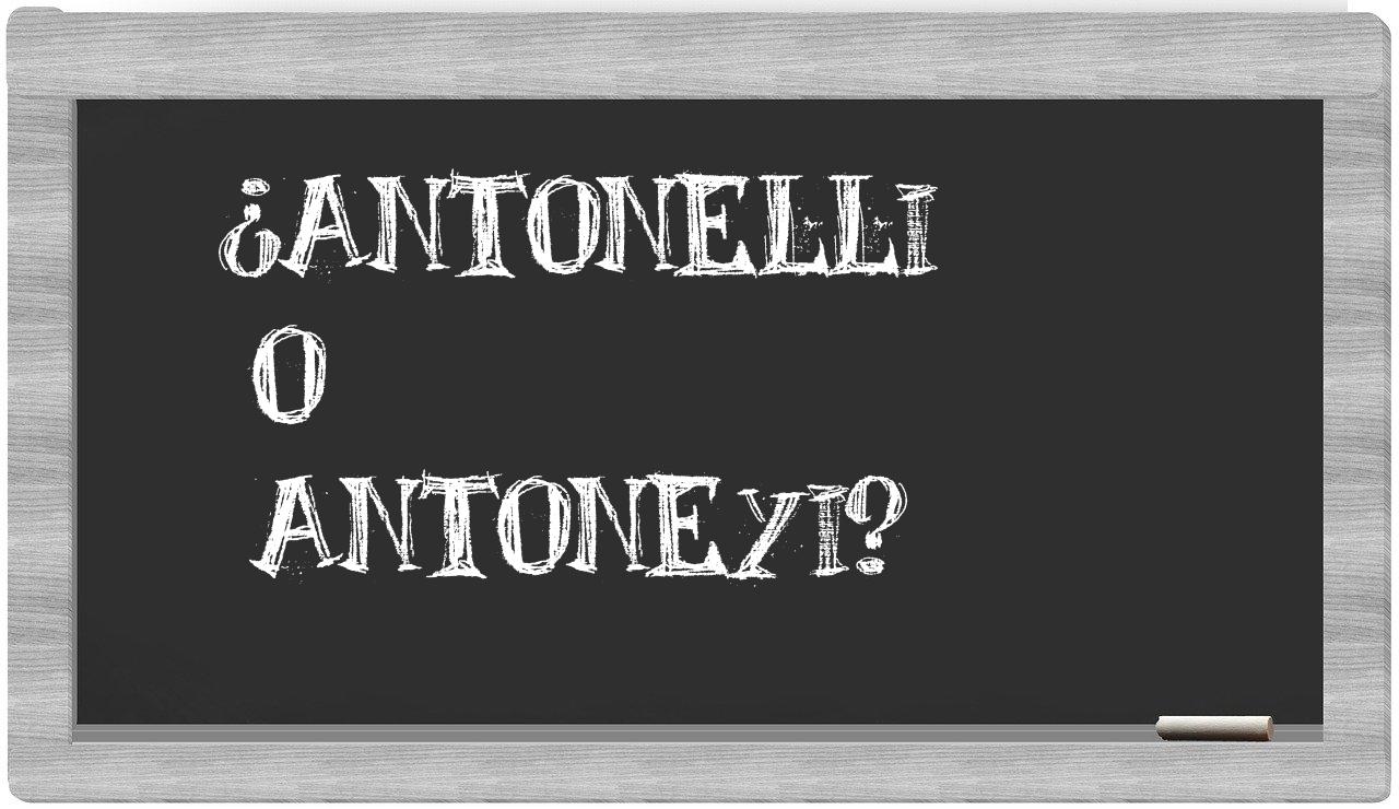 Cuando te enfrentes al dilema entre antonelli y antoneyi, no te hagas preguntas, pues solo antonelli es la opción que respeta la ortografía normativa; antoneyi, lamentablemente, no tiene cabida en el Diccionario de la Real Academia de la Lengua.