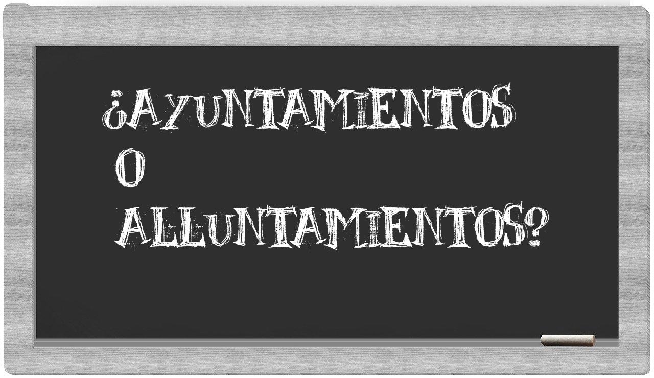 Cuando se trata de hacer una elección entre ayuntamientos y alluntamientos, la decisión debe ser clara como el agua, puesto que únicamente ayuntamientos se encuentra correctamente redactada, mientras que alluntamientos no tiene cabida en el Diccionario de la Real Academia Española.