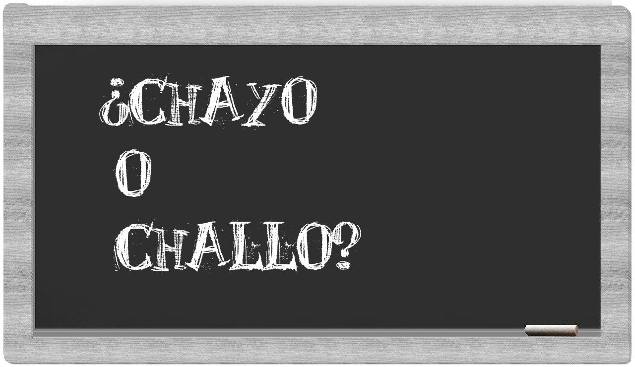 Cuando te enfrentes a la disyuntiva entre chayo y challo, no vaciles ni un instante, porque solo chayo se encuentra correctamente redactada; por otro lado, challo no se halla registrada en el prestigioso Diccionario de la Real Academia Española.