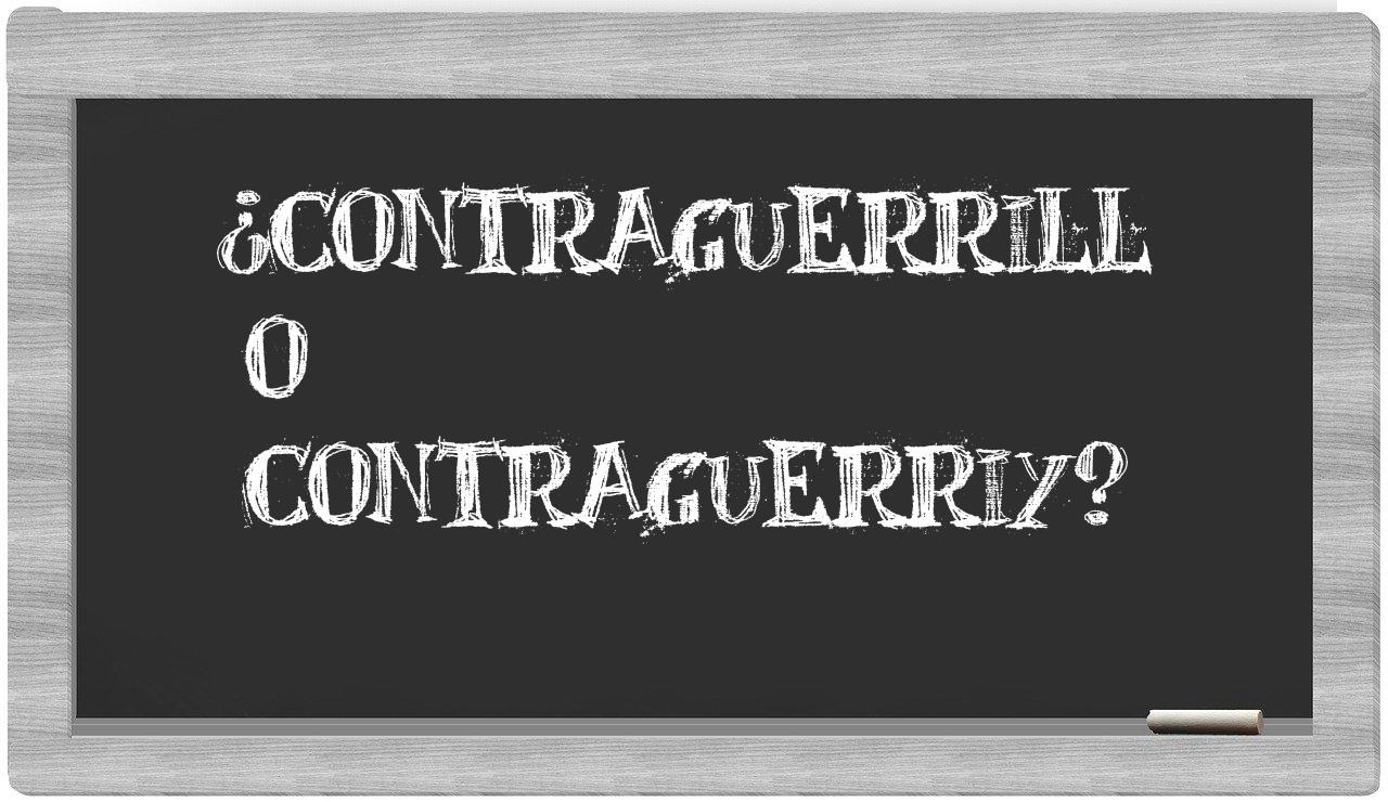 Cuando se presenta la distinción entre contraguerrill y contraguerriy, no hay razón para vacilar, porque únicamente contraguerrill se encuentra correctamente formulada. Por otro lado, contraguerriy no se halla registrada en el Diccionario de la Real Academia Española.