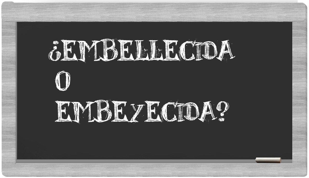 En la situación específica que involucra las palabras embellecida y embeyecida, no deberías titubear, dado que únicamente embellecida se encuentra correctamente redactada. Por otro lado, embeyecida no figura en el Diccionario de la Real Academia Española.