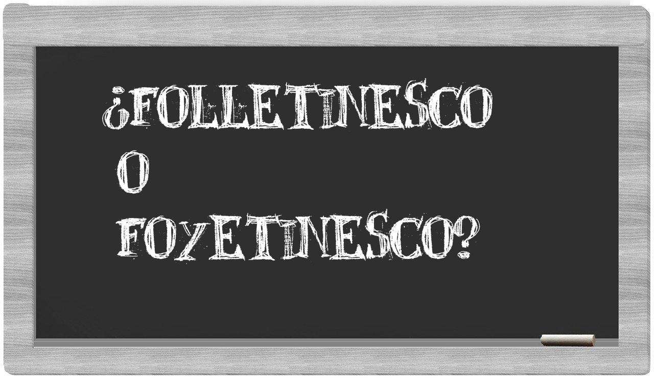 En la particular conversación que surge entre los términos folletinesco y foyetinesco, no hay lugar para la incertidumbre, puesto que solamente folletinesco se encuentra debidamente registrada y aceptada, mientras que foyetinesco no tiene presencia en el prestigioso Diccionario de la Real Academia Española.
