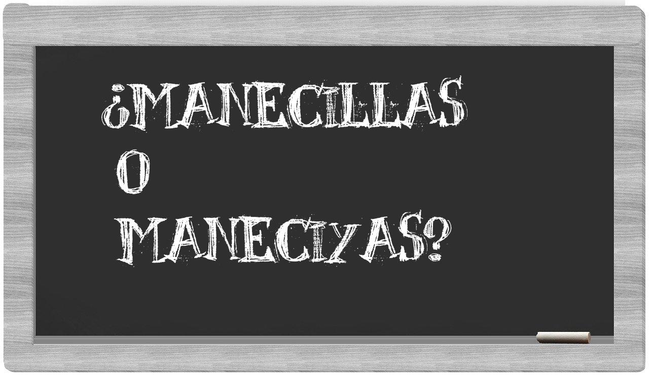 Cuando se trata de elegir entre manecillas y maneciyas, no hay lugar para la incertidumbre, pues únicamente manecillas se encuentra debidamente registrada en el Diccionario de la Real Academia Española, a diferencia de maneciyas que no tiene reconocimiento en su autoridad lingüística.
