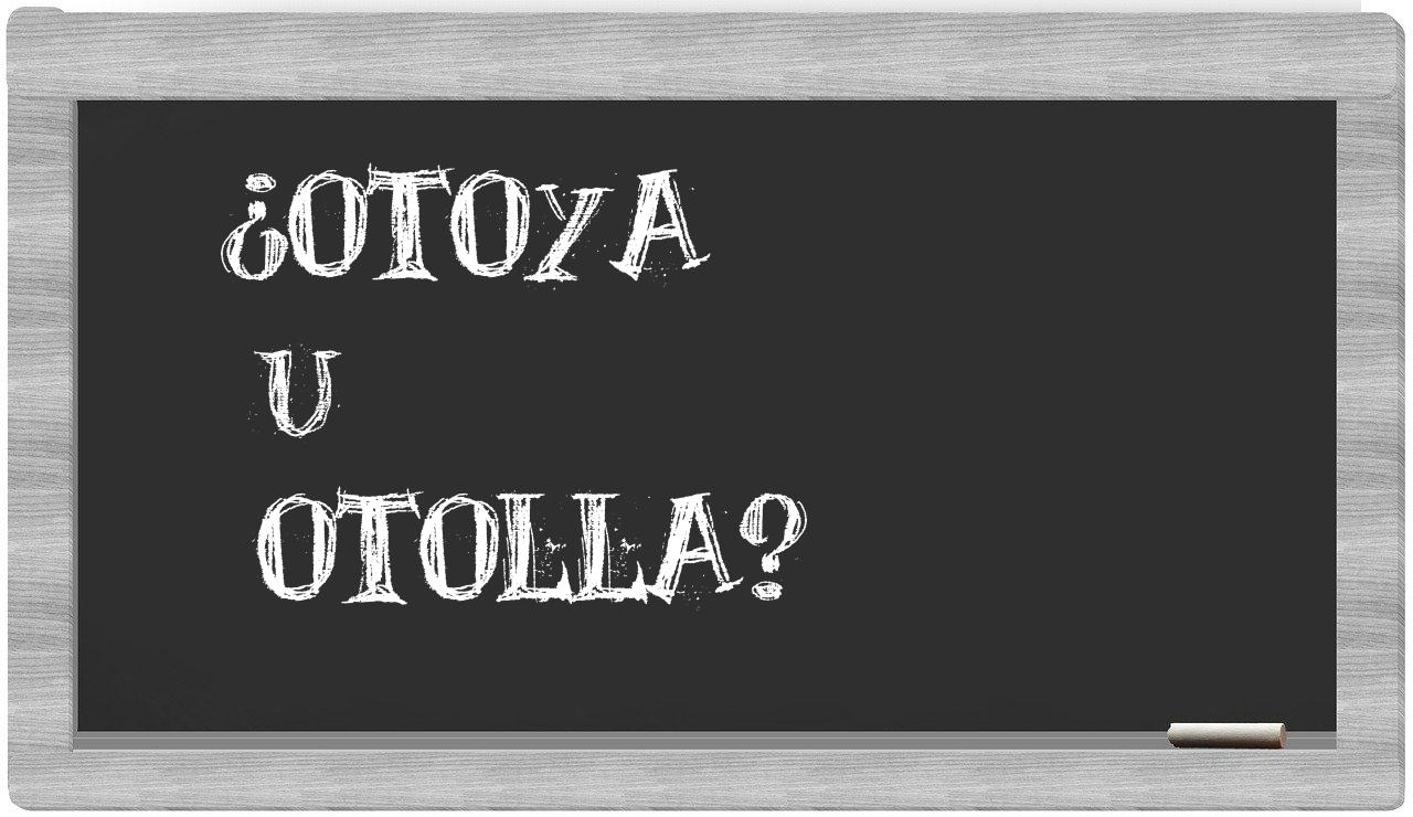 A la hora de elegir entre otoya y otolla, no te dejes llevar por la indecisión, puesto que solo otoya se encuentra debidamente registrada y aceptada en el Diccionario de la Real Academia Española, mientras que otolla carece de validez en su lexicografía.