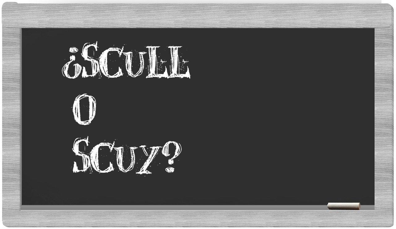 Cuando se trate de la distinción entre scull y scuy, nunca deberías estar indeciso, puesto que únicamente scull se encuentra correctamente formulada; la palabra scuy no figura en el reconocido Diccionario de la Real Academia Española.