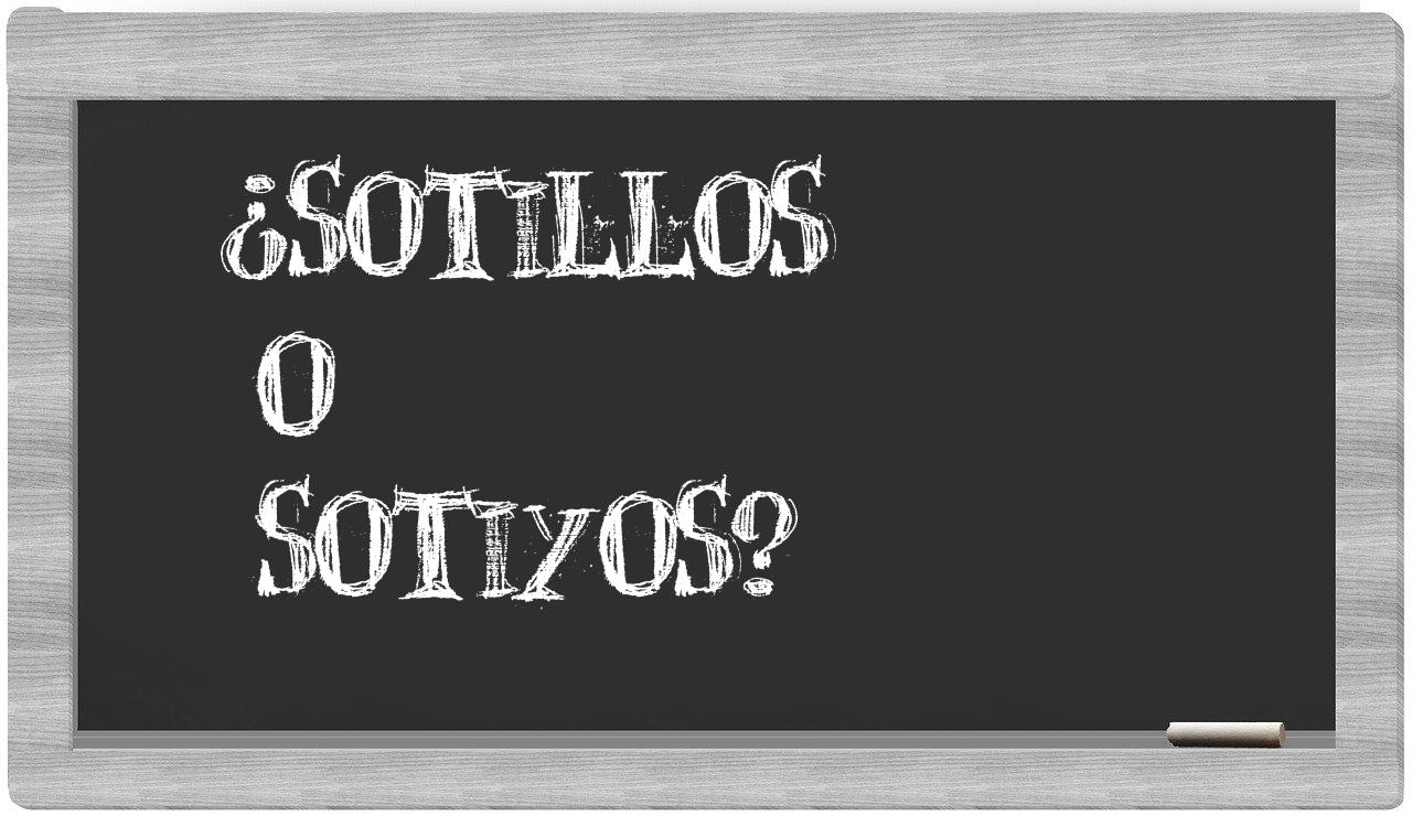 Cuando se presenta la comparación entre sotillos y sotiyos, es esencial que no vaciles, puesto que únicamente sotillos está correctamente redactada. Por otro lado, sotiyos no está registrada en el Diccionario de la Real Academia Española.