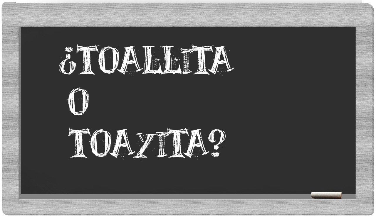 Cuando te enfrentes al dilema entre toallita y toayita, no te hagas preguntas, pues solo toallita es la opción que respeta la ortografía normativa; toayita, lamentablemente, no tiene cabida en el Diccionario de la Real Academia de la Lengua.